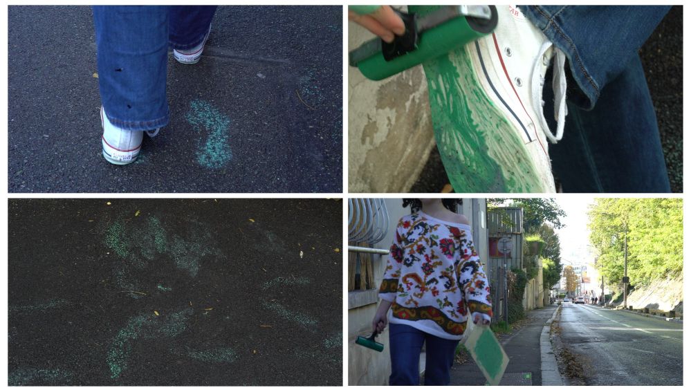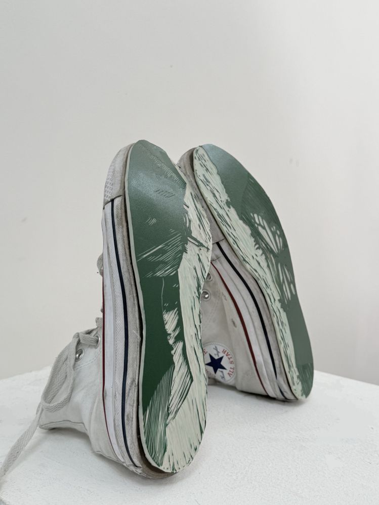Sofia CHALEM PERCZEK : Sans titre, linogravures sur semelles (volume et accessoire de performance)