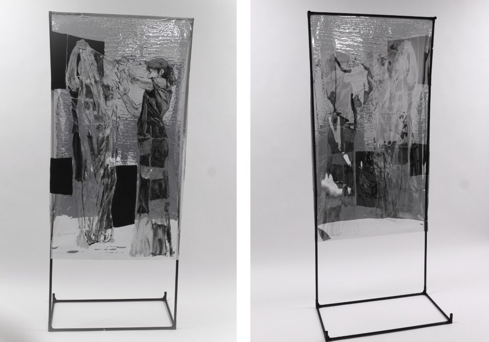 Fanny MEGRET : Papa, est-ce qu’on devient plus transparent ? acrylique, stylo sur papier sans tain, métal, 198 x 82 x 40 cm