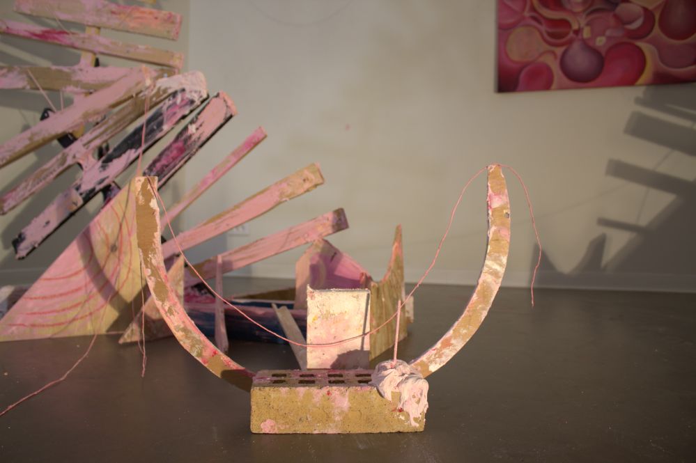 Milo BERTHET : Sans titre (provisoire), huile sur toile, bois, enduit, brique, corde, projecteur, 264 x 365 x 433 cm