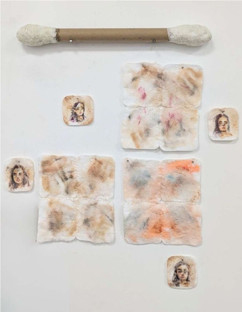 Léa LEFORT LE CARRET : Sans titre (provisoire), maquillage, cotons démaquillants, carton, 63 x 58 cm l’ensemble (ci-dessous détails)