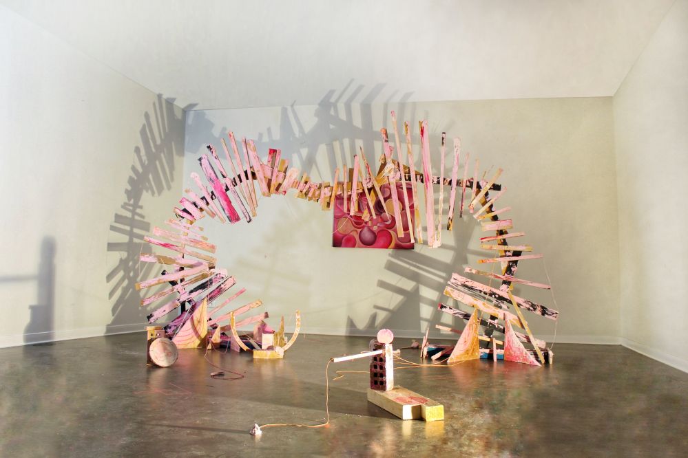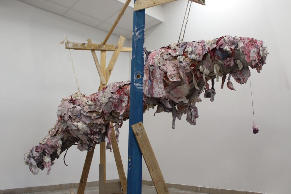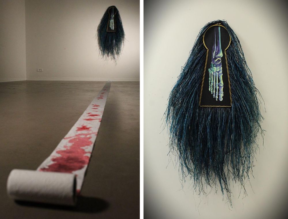 Romane AUFFRET : Il faut mourir, Madame, acrylique, carton, bois, raphia, papier toilette, 140 x 60 x 8 cm (Peinture au mur)