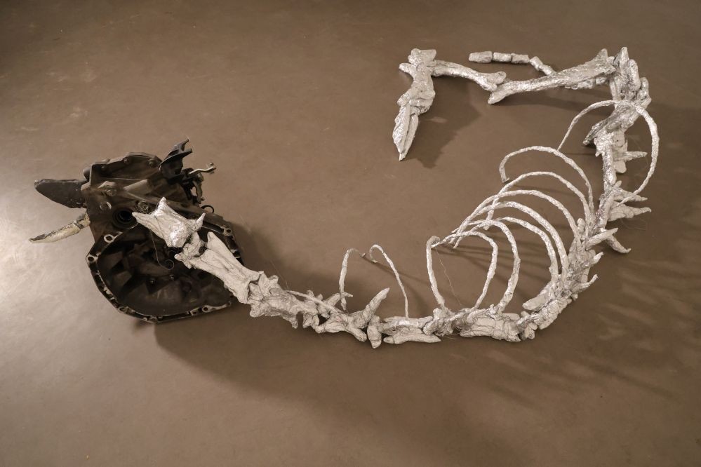 Yiqing LIU : Vache (ossements), fragment de moteur en acier, polystyrène, fil de fer, papier aluminium, pâte à modeler, 46 x 257 x 96 cm