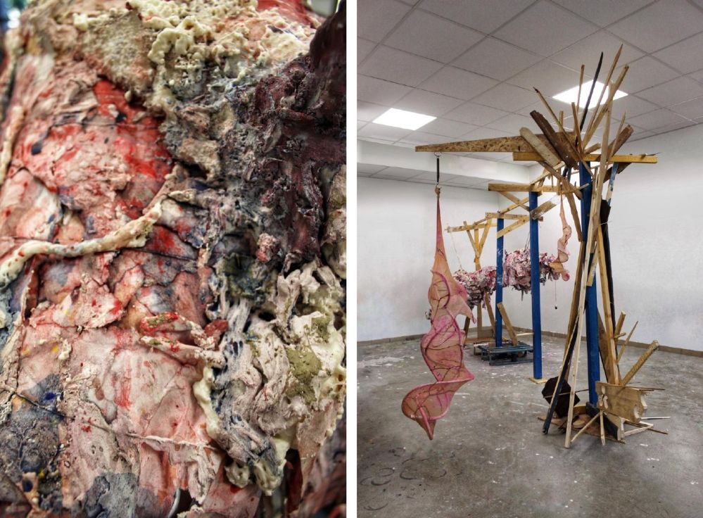 Milo BERTHET : Sans titre (provisoire), huile, bois, fer, toile, mousse expansive, papier, corde, 270 x 488 x 237 cm