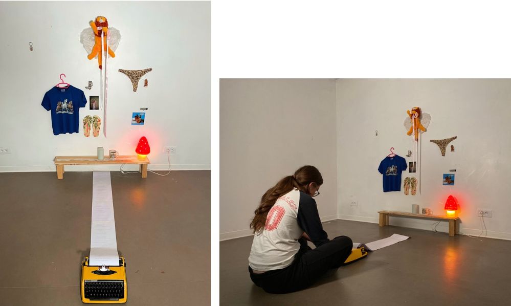 Abigaël PATUCCA : Autel au kitsch : installation et performance (taper sur une machine, sans ruban encreur, un ensemble de prières futiles, décalées ou humanistes, suffisamment nombreuses pour que le papier puisse rejoindre matériellement l’autel)