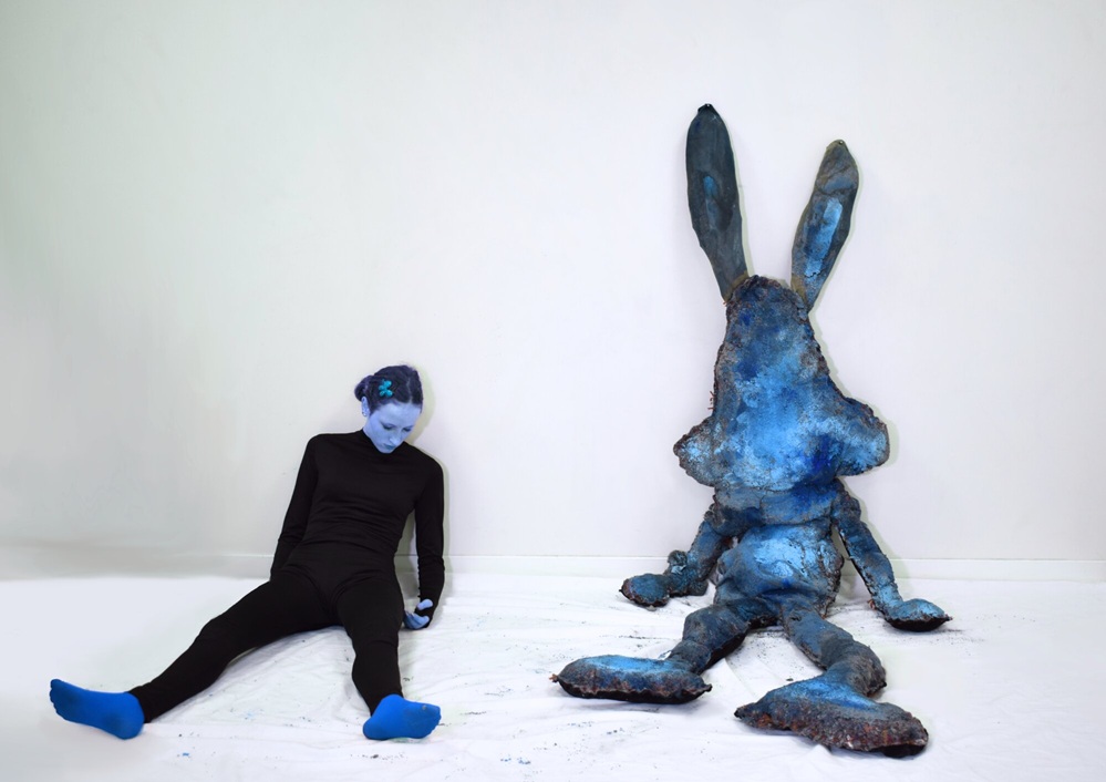 Océane BOS : Lapinou, photographie, tirage souhaité 80 x 120 cm / Volume : fragments de mousse de matelas, tissus, couverture de déménagement, collants, acrylique sur béton